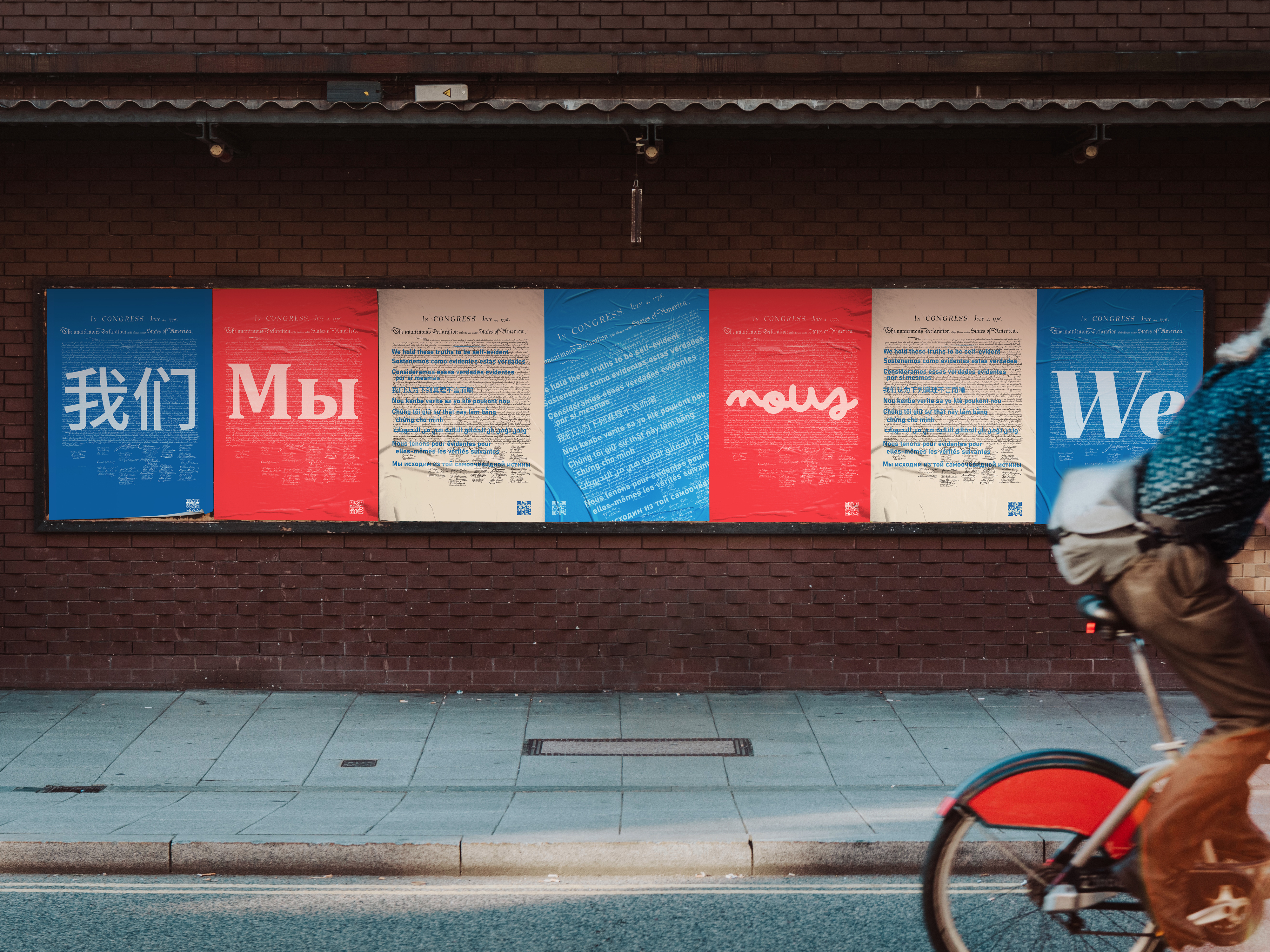 To attempt to capture the true diversity, tonality, and consciousness of the American experience in one gesture is second only in difficulty to defining the meaning of life. The act of speaking up is foundationally American, but how that act manifests itself and the breath of those expressions defines our melting pot culture. The Declaration Poster Series is a means to give voice - a celebration of the cacophony that is the American point of view. Situated in the birthplace of the United States, these banners visualize the languages of Philadelphia and understanding that Philadelphia has many histories and just as many futures.